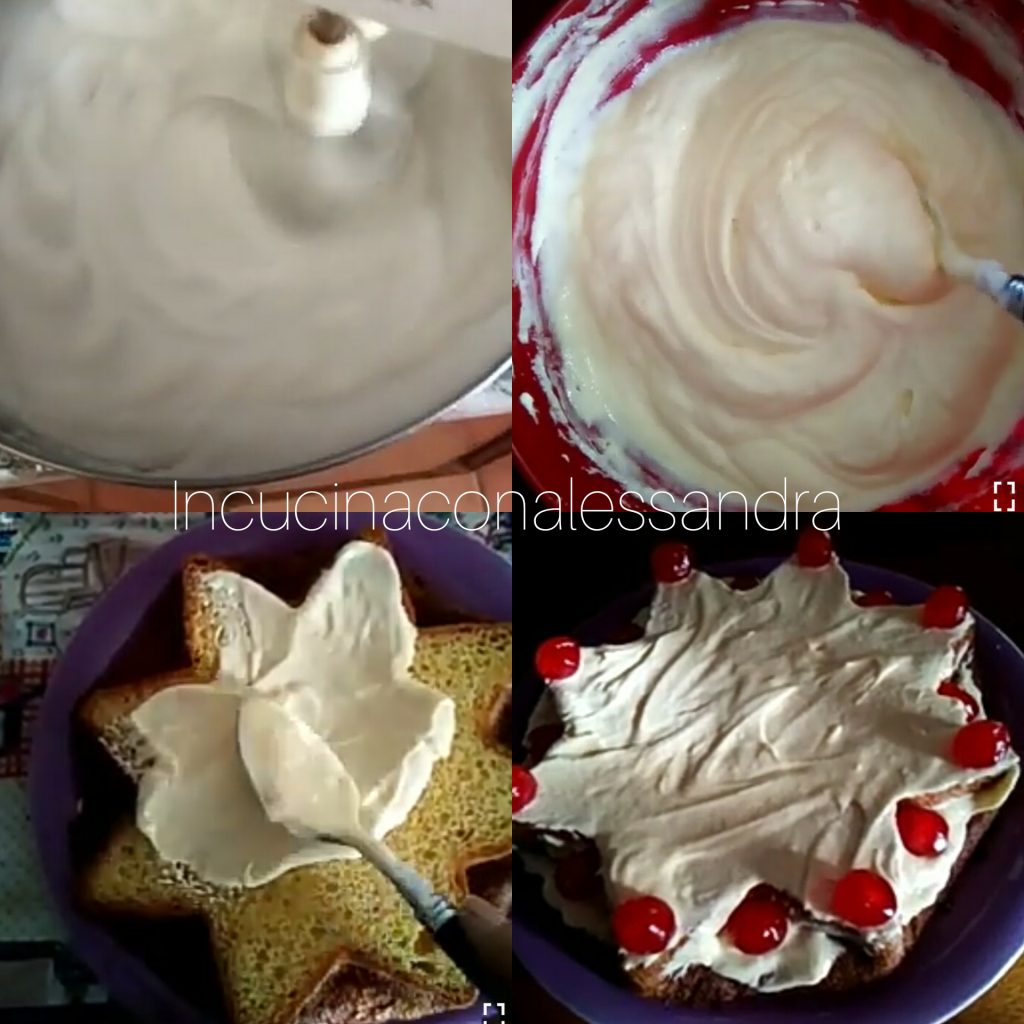Schneiden Sie die Basis des Pandoro ab. Eiweiß steif schlagen. In einer Schüssel Eier und Zucker schlagen und den Mascarpone bei Raumtemperatur unterrühren. Dann das steif geschlagene Eiweiß unterheben. Mit dem elektrischen Mixer die Sahne mit dem Puderzucker aufschlagen und zur Mascarponecreme hinzufügen. Den Stern mit einer schönen Schicht Creme füllen. Mit kandierten Kirschen dekorieren