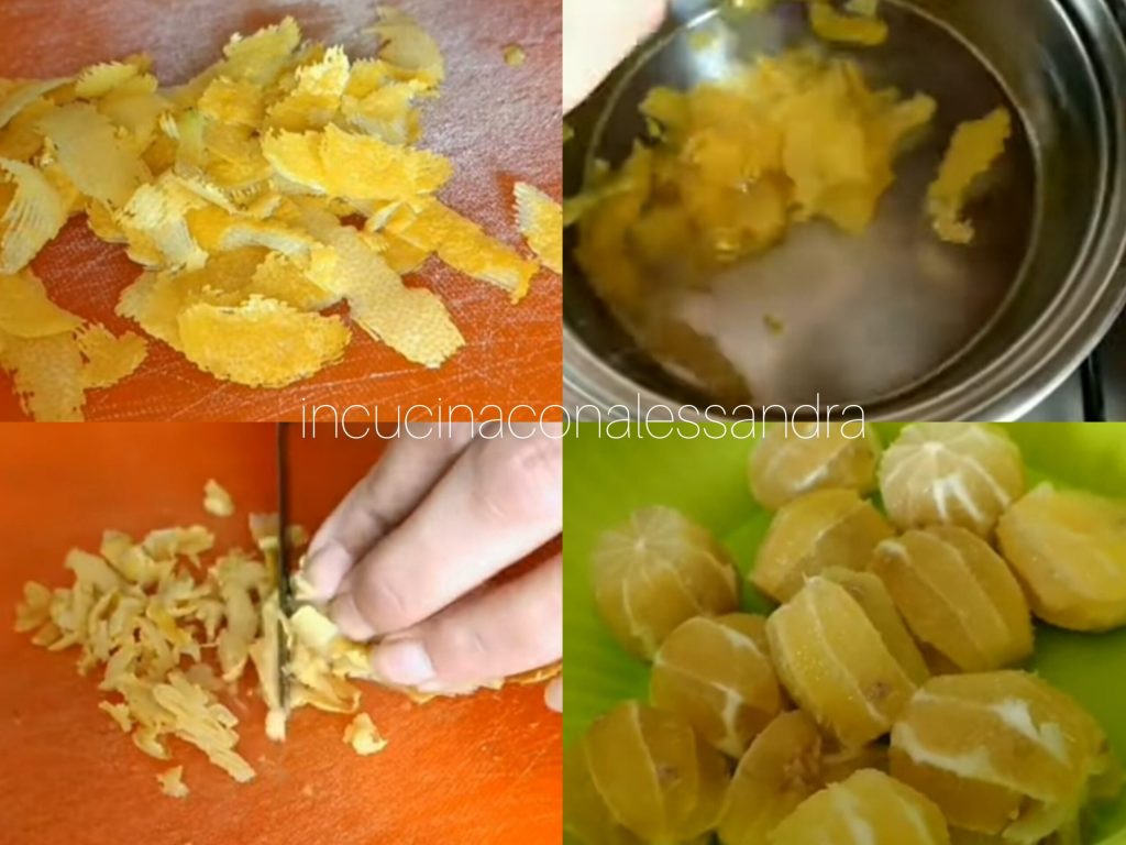 Zuerst die Zitronen und Orangen gründlich waschen. Ich empfehle, Bio-Früchte zu verwenden, falls nicht verfügbar, die Schale gut abwaschen, um eventuelle chemische Rückstände zu entfernen. Mit einem Schäler die Zitronenschale ohne das Weiße entfernen, in einen kleinen Topf mit Wasser geben und zum Kochen bringen, die blanchierte Schale nehmen und in Streifen schneiden.