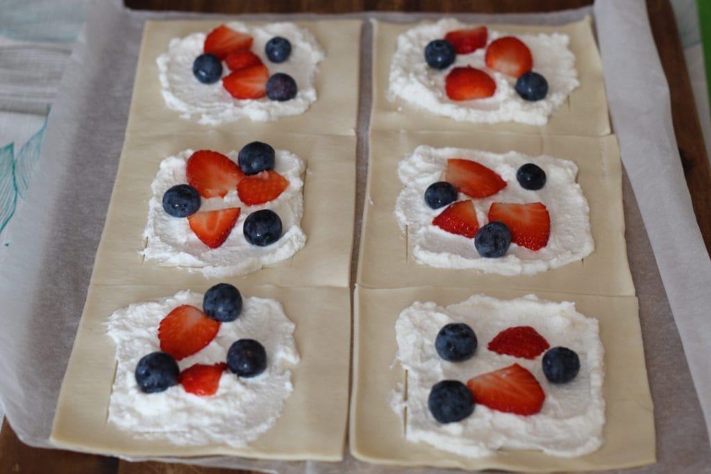 Schritte zur Zubereitung von Blätterteiggebäck mit Ricotta, Erdbeeren und Heidelbeeren