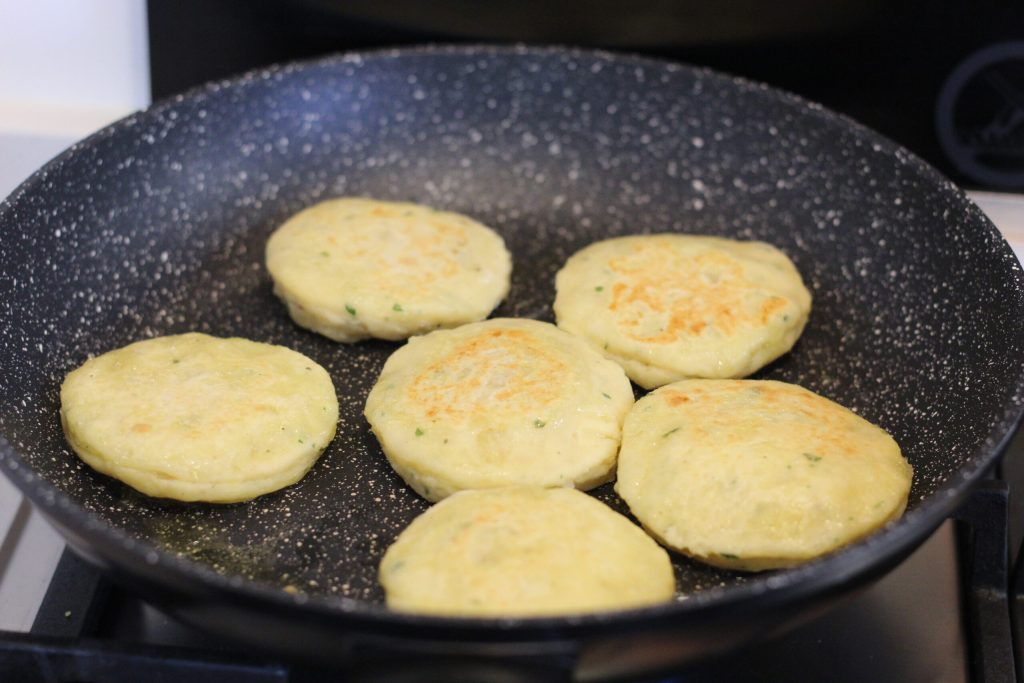 Erhitzen Sie dann etwas extra natives Olivenöl in einer Antihaftpfanne, und braten Sie die Kartoffelfladen, bis sie schön goldbraun sind. Etwa 5/7 Minuten pro Seite. Drehen Sie sie häufig, damit sie gleichmäßig garen.