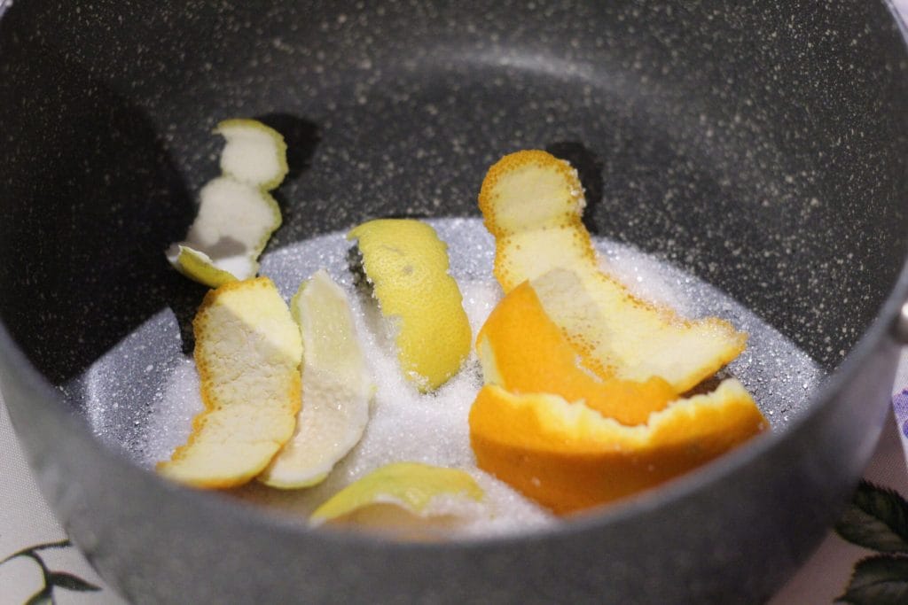 • Um den Glühwein zuzubereiten, waschen Sie zuerst das Obst gründlich. Nehmen Sie eine Pfanne mit hohem Rand, geben Sie 60 Gramm Zucker und die Schalen von einer halben Orange, einer halben Zitrone und einem halben Apfel hinein.