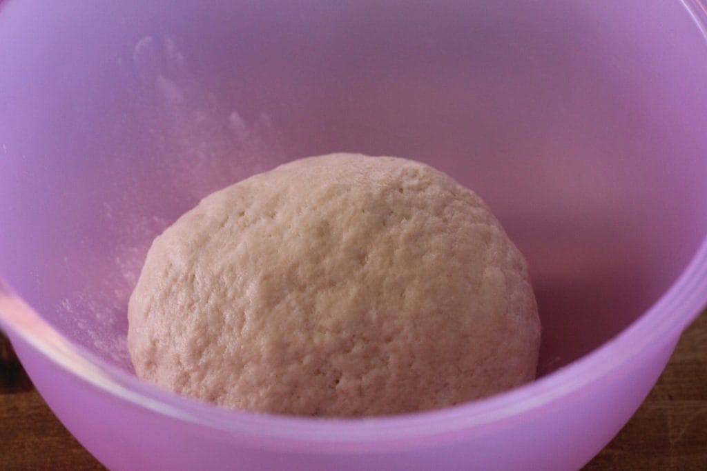 Nach der Gehzeit den Teig auf die bemehlte Arbeitsfläche legen und in 6 Stücke teilen, die jeweils etwa 150 Gramm wiegen. Wenn Sie möchten, können Sie sie auch kleiner machen. Formen Sie runde Kugeln und schleifen Sie den Teig.
