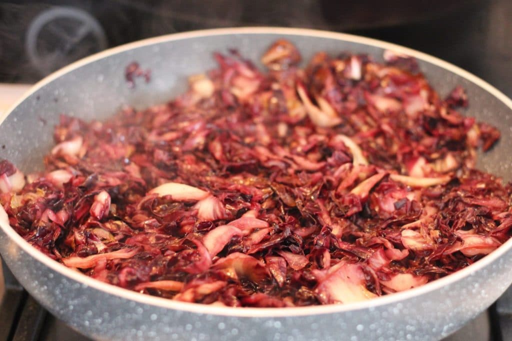 Um die Lasagne mit Radicchio und Speck zuzubereiten, reinigen Sie zunächst den runden roten Radicchio gründlich, indem Sie den Boden, also den harten Teil, entfernen, waschen Sie ihn gründlich unter fließendem Wasser und schneiden ihn in nicht zu dünne Streifen. Auch die Schalotte säubern und schneiden, sie in eine beschichtete Pfanne mit etwas extra nativem Olivenöl geben und kurz anbraten lassen, dann den Radicchio hinzufügen, nach Belieben salzen und pfeffern, ein paar Minuten kochen lassen und dann mit Rotwein bei hoher Hitze ablöschen und verdunsten lassen. Die Garzeit beträgt weitere 6 Minuten, da der Radicchio in kurzer Zeit gart. Dann die Hitze ausschalten und abkühlen lassen.