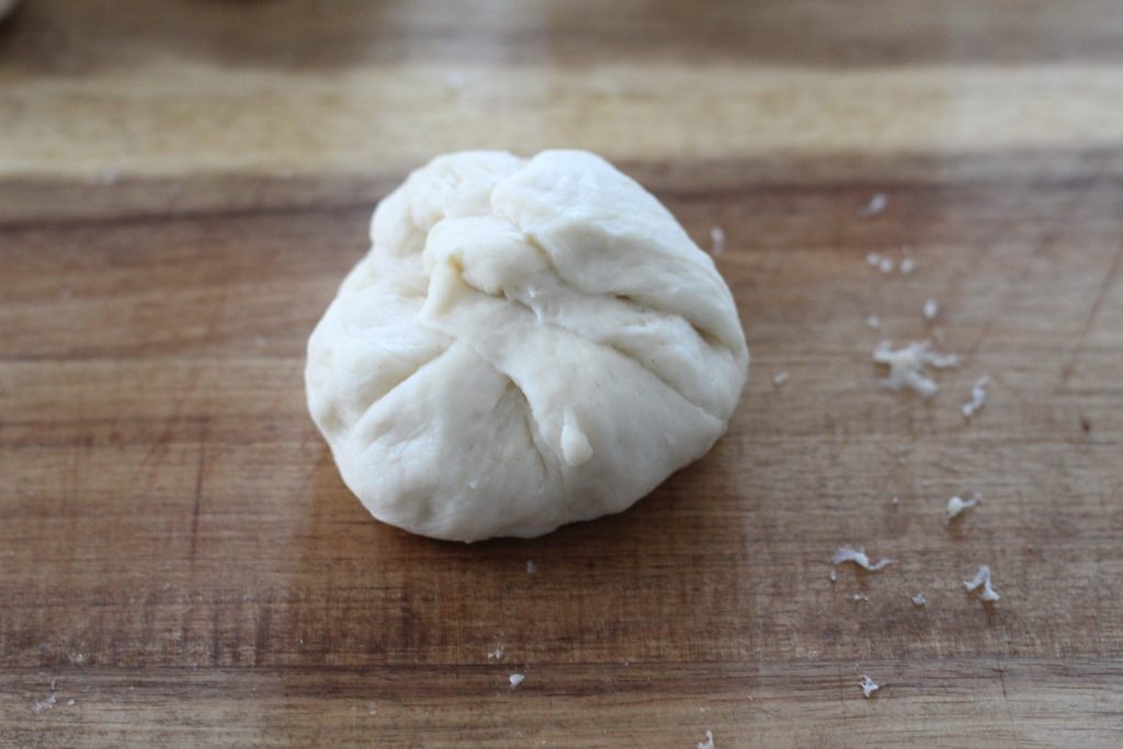 Den Teig in Kugeln von etwa 80 Gramm teilen. Jedes Teigstück am Rand greifen und die Ränder zur Mitte falten. Dann die Kugel auf der Arbeitsfläche mit der hohlen Hand abrunden, so entsteht eine glatte Oberfläche. Die Kugeln auf ein mit Backpapier ausgelegtes Backblech setzen, etwas Abstand lassen, da sie nochmals aufgehen. Weitere ca. 1 Stunde gehen lassen.
