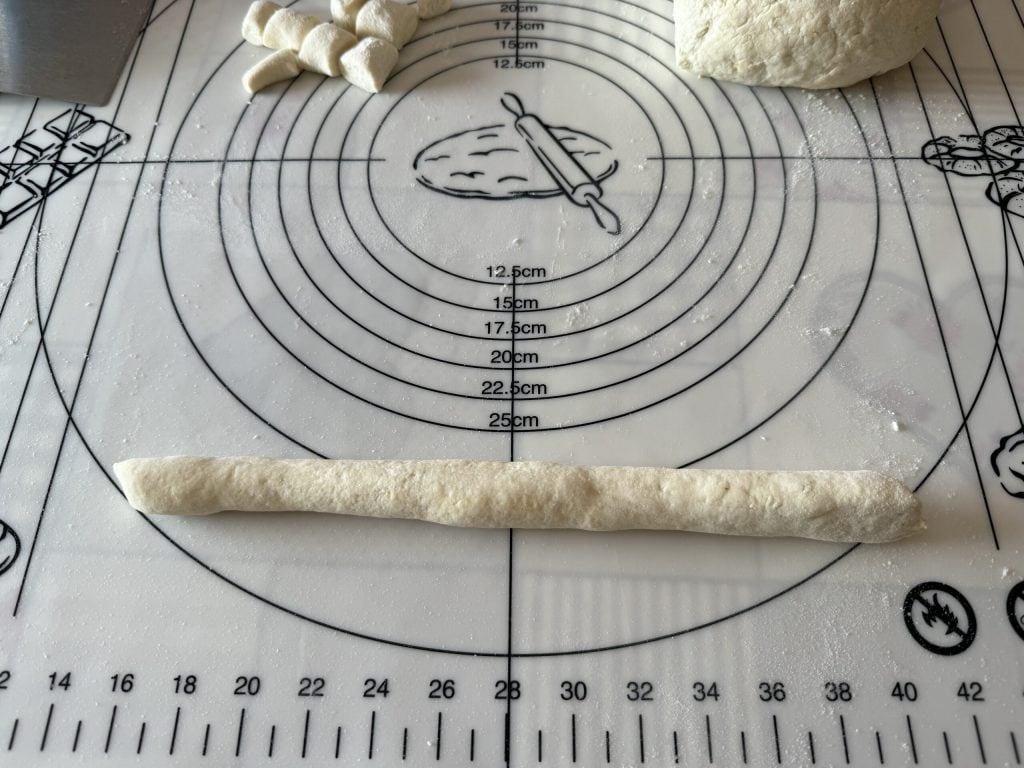 • Kneten Sie den Teig ein paar Minuten mit leicht bemehlten Händen, damit der Teig glatt und homogen wird. Schneiden Sie nun mit einem Teigschaber kleine Stücke ab und formen Sie mit bemehlten Händen kleine Rollen. Schneiden Sie die Gnocchi in der gewünschten Größe, Sie können sie auch mit einer Gabel formen oder glatt lassen.