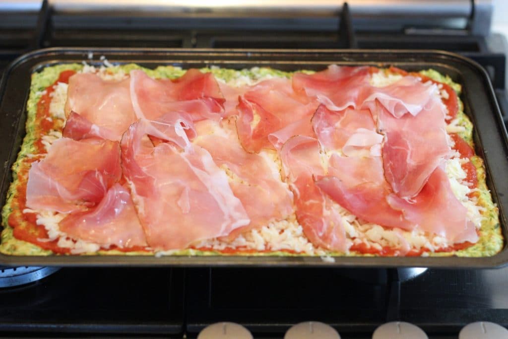 Schritte zur Zubereitung der Zucchini-Pizza mit Speck