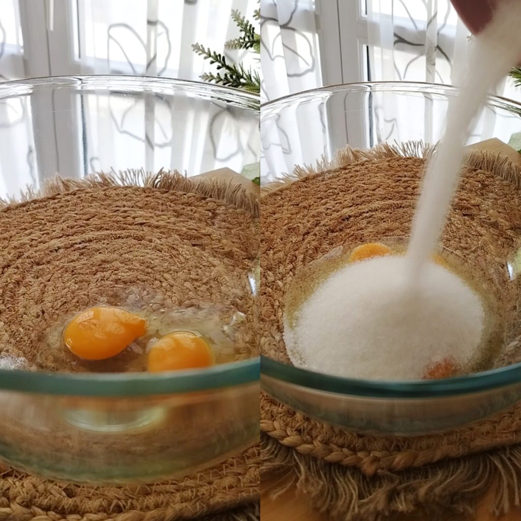 Diese eintunkbaren Kekse sind einfach zuzubereiten. Zuerst nehmen Sie eine Schüssel und geben die Eier mit dem Zucker hinein.