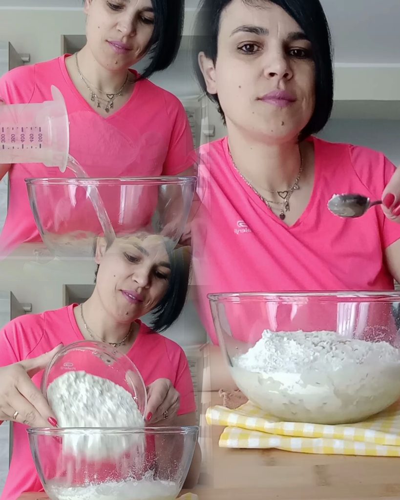 Geben Sie in eine Schüssel Wasser, Mehl, zwei Teelöffel Salz und zwei Esslöffel extra natives Olivenöl.