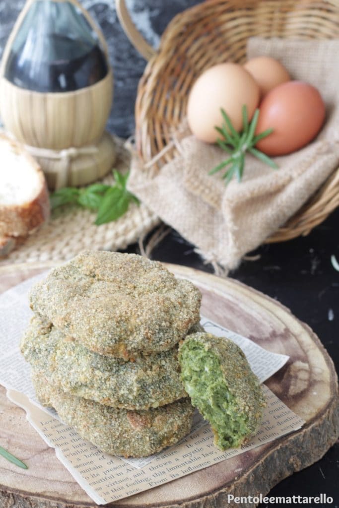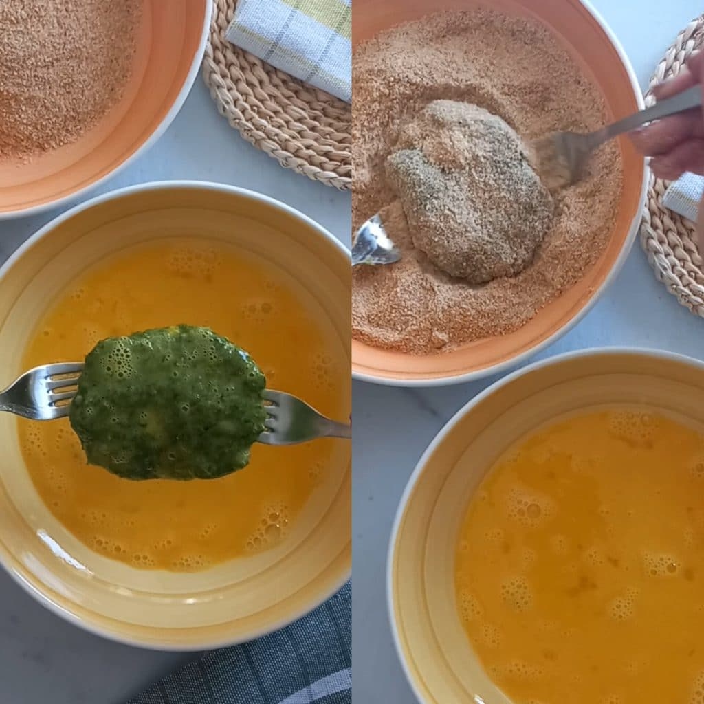 Sobald sie fertig sind, tauchen Sie jedes Spinatschnitzel zuerst in das geschlagene Ei und dann in das Paniermehl, helfen Sie sich mit einer Gabel, um sie nicht zu zerbrechen.