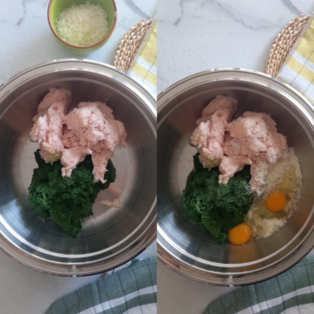 Geben Sie das Hähnchen, den Spinat, die Eier, den geriebenen Parmesan und etwas Salz in eine Schüssel.