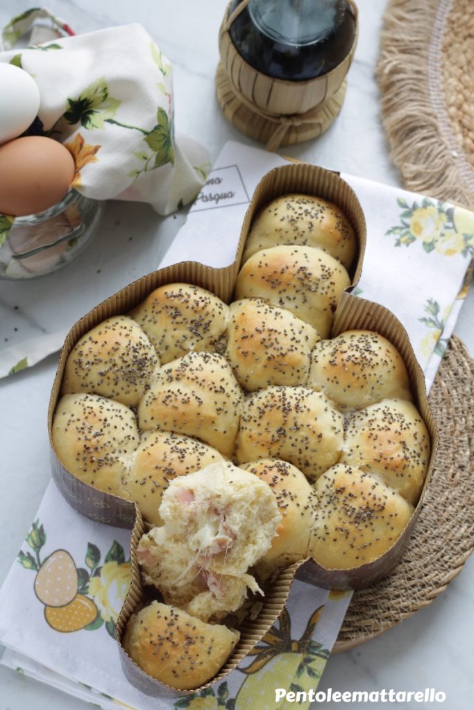 Das ist ein einfaches Rezept, auch für weniger Erfahrene geeignet. Der Teig, auf Basis von Mehl, Eiern, Milch, frischer Hefe und Salz, wird von Hand bearbeitet. Nach dem Aufgehen formt man viele kleine Kugeln, die mit gekochtem Schinken, Salami und Provola gefüllt werden. Entsprechend der Form der Colomba werden die Kugeln ohne Schwierigkeiten in die Form gesetzt. Man lässt sie erneut gehen, bis die Kugeln den Rand der Form erreichen. Abschließend wird die Oberfläche mit verquirltem Ei bestrichen und mit Chiasamen bestreut, für einen dekorativen und einladenden Touch.