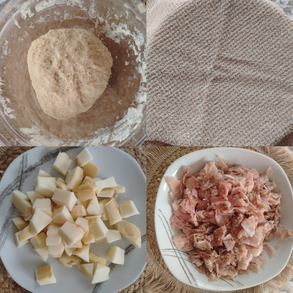 Während der Teig geht, die Wurst und die Provola in Würfel schneiden und beiseitestellen.