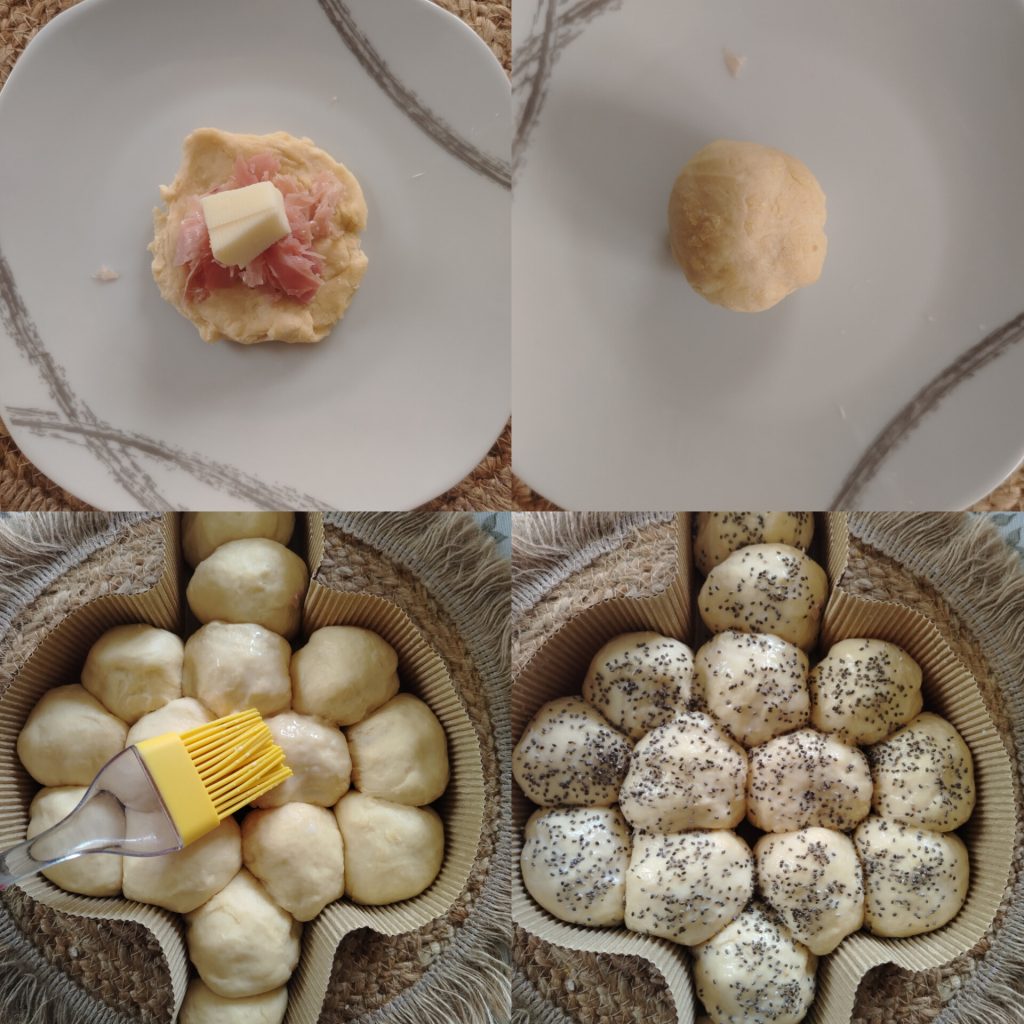 Nach der Gehzeit den Teig erneut nehmen und Stücke von je 40 g abtrennen. Die Kugel leicht flach drücken und mit gekochtem Schinken, Salami und Provola füllen. Die Ränder schließen und eine Kugel formen. Die Kugeln in die Colomba-Papierform legen und dabei alle Bereiche füllen.