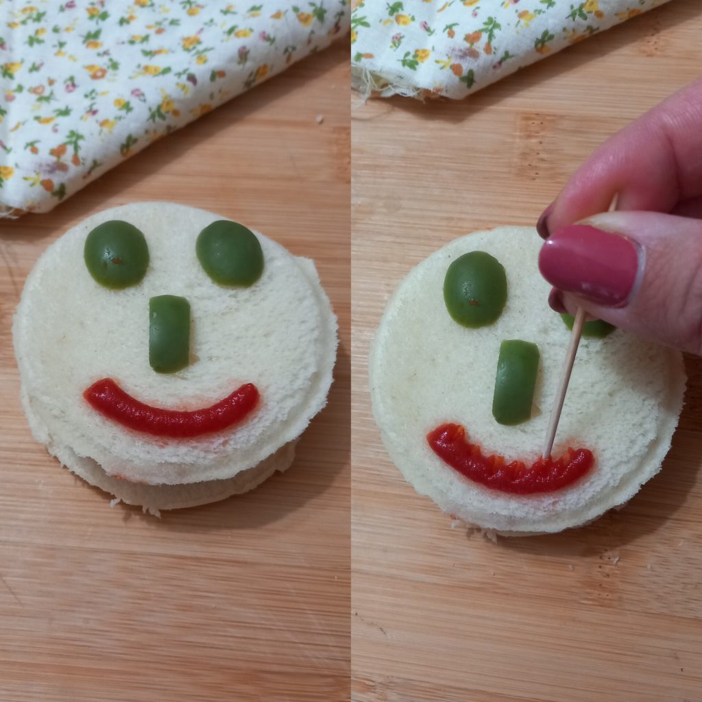 Nun gestalten wir das Gesicht. Setzen Sie die Augen und die Nase und verwenden Sie Ketchup, um den Mund zu formen. Mit einem Zahnstocher leicht verwischen, um das Gesicht etwas unheimlich aussehen zu lassen.