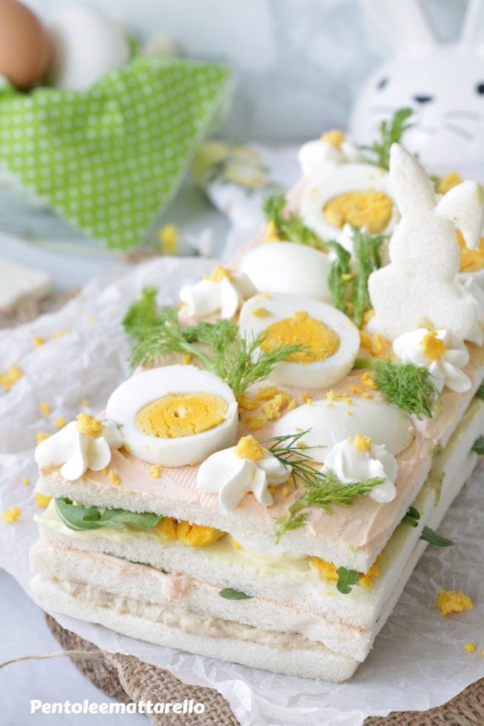 Die Oster-Tramezzino-Torte ist eine köstliche und eindrucksvolle Vorspeise oder ein Aperitif, perfekt, um den Festtagstisch zu bereichern. Ich habe eine einfache und schnelle Variante zubereitet, gefüllt mit Thunfisch, Mayonnaise, Lachs-Frischkäse, Rucola und hartgekochten Eiern. Die Auswahl der Zutaten könnt ihr natürlich nach eurem Geschmack anpassen und je nach dem geplanten Menü variieren. Zum Beispiel passt mein Vorschlag zu einem Menü mit Fisch, aber wenn ihr möchtet, könnt ihr auch traditionellere Füllungen wie gekochten Schinken, Salami und Käse wählen.