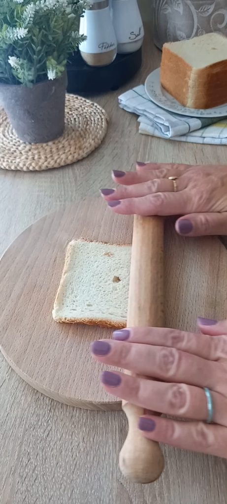 Legen Sie das Toastbrot auf ein Holzschneidebrett und glätten Sie die Scheibe mit einem Nudelholz.