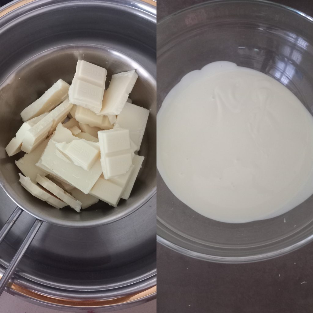 In der Zwischenzeit kümmern wir uns um die Füllung. Schmelzen Sie die weiße Schokolade im Wasserbad.