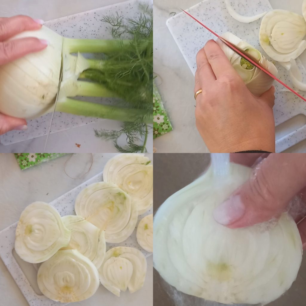 Als erstes schneiden Sie das Fenchelgrün ab, entfernen den Stiel und schälen die äußere Schicht ab. Schneiden Sie vertikale Scheiben mit einer Dicke von etwa 4-5 mm.