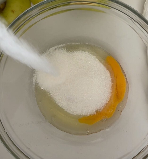 Den Kuchen vorbereiten, indem man in einer Schüssel Eier und Zucker vermischt.