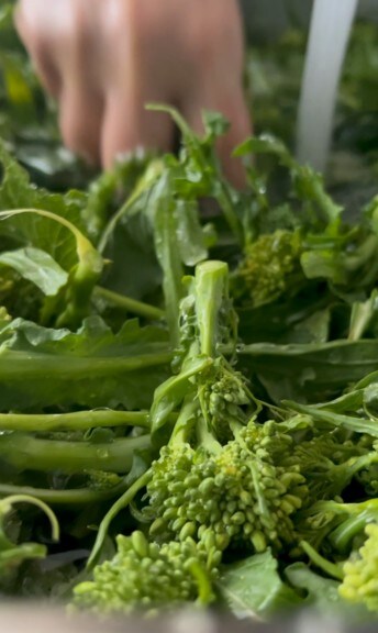 Das erste, was zu tun ist, ist den Rübstiel gründlich zu waschen und die härteren Blätter und Stiele zu entfernen.