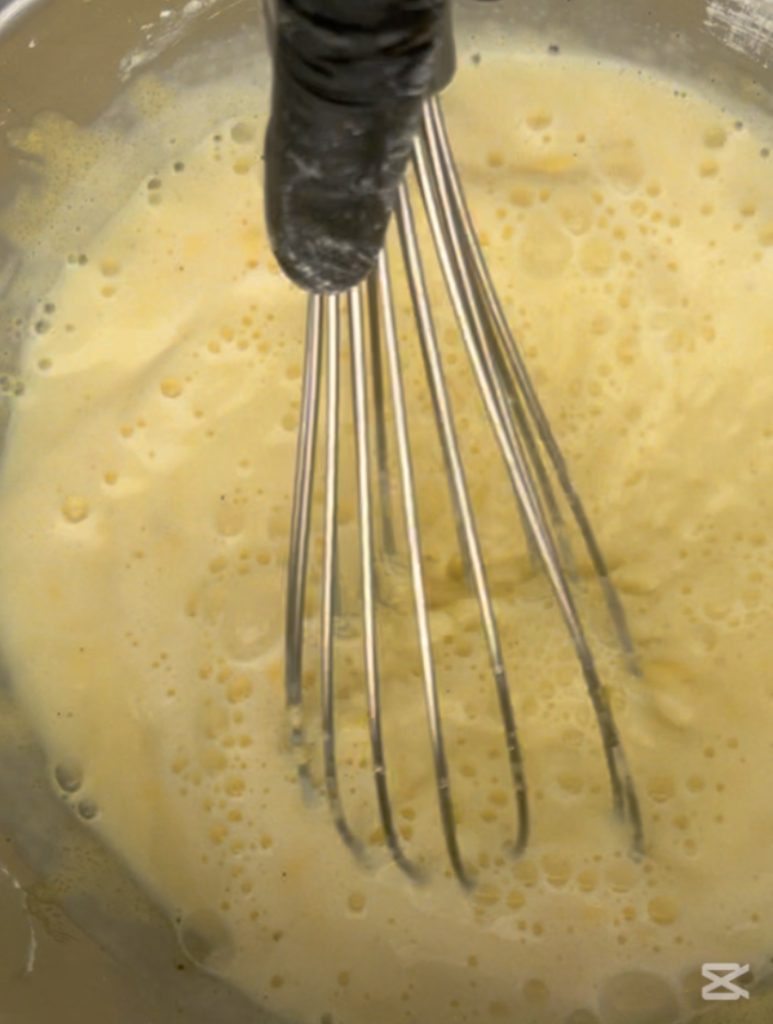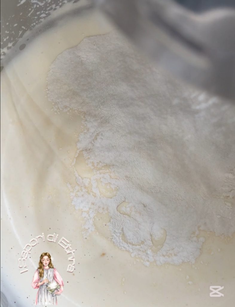Verarbeite die Mischung etwa 10 Minuten lang, bis sie ihr Volumen verdreifacht. Dann mit einem Spatel das gesiebte Mehl von Hand einfügen.