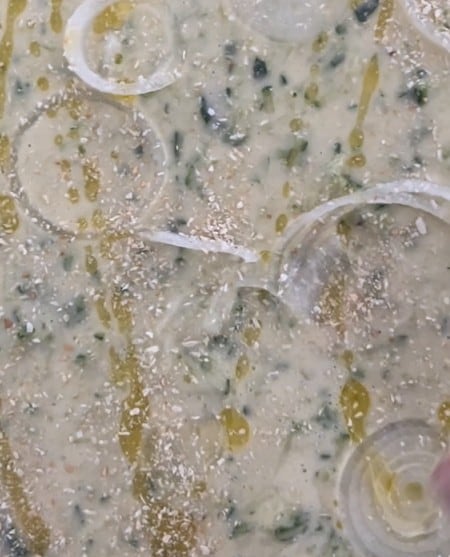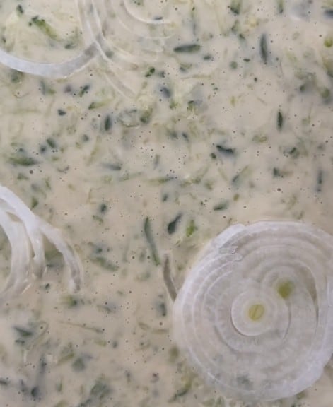 Die Zwiebel sehr dünn geschnitten hinzufügen