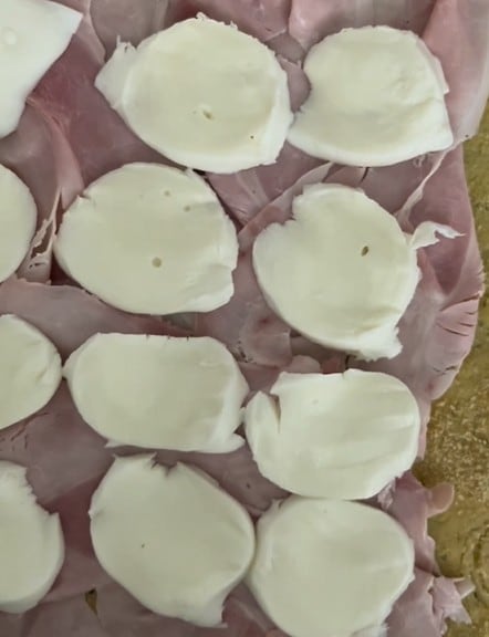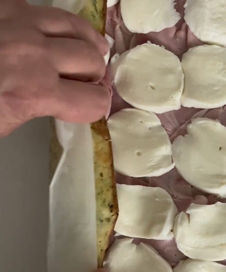 Sobald sie abgekühlt ist, den Fladen zuerst mit Schinken füllen