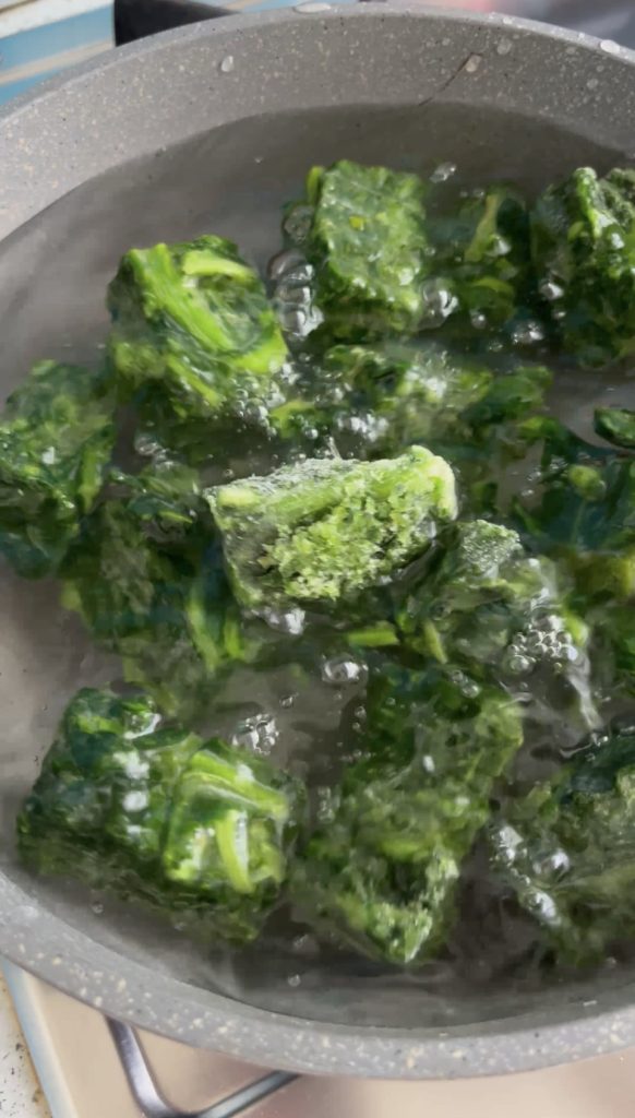 Zuerst die gefrorenen Spinatwürfel in reichlich Wasser kochen, bis sie aufgetaut sind.