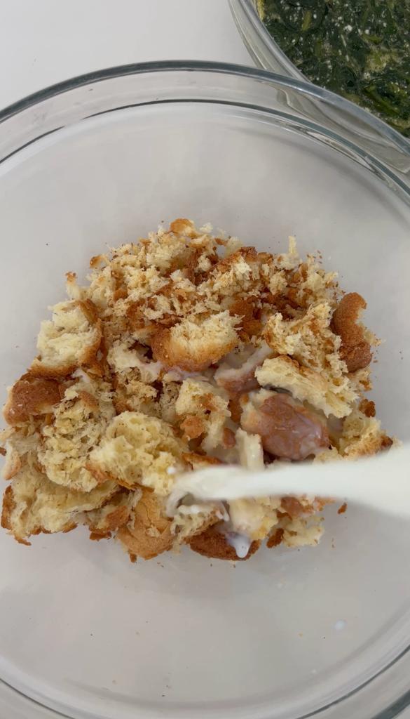 Das eingeweichte Brot zu Spinat und Eiern hinzufügen.