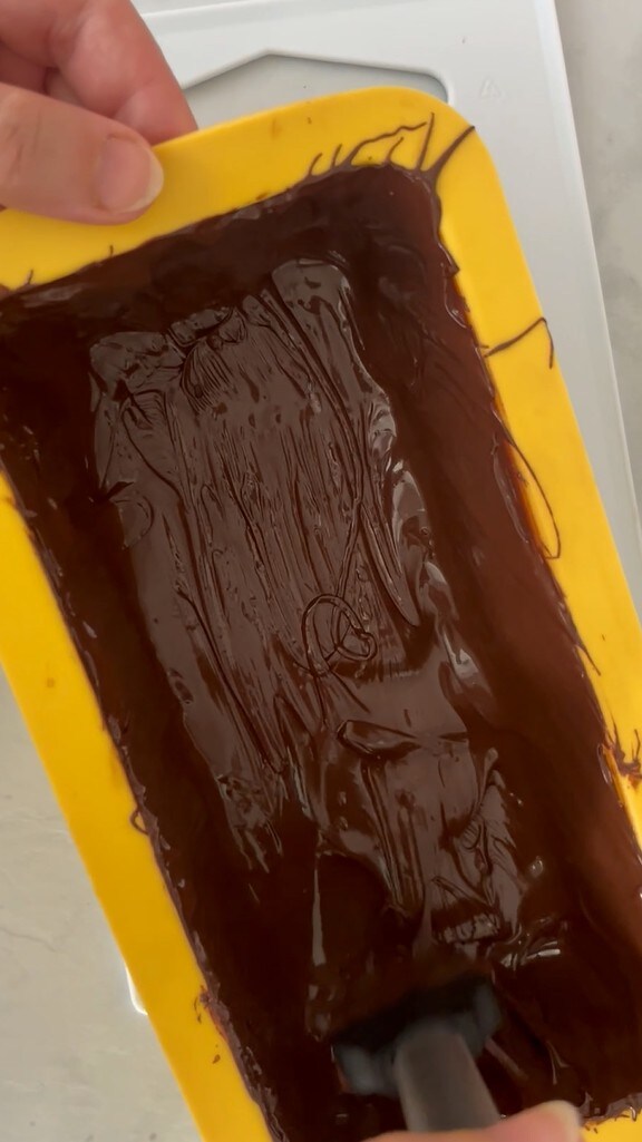Mit einem Spatel oder Pinsel die ganze Form mit Schokolade überziehen