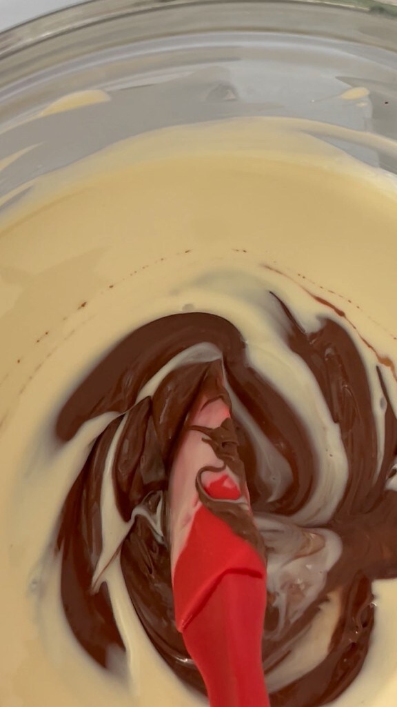 Die gleiche Prozedur mit weiteren 100 g dunkler Schokolade wiederholen.