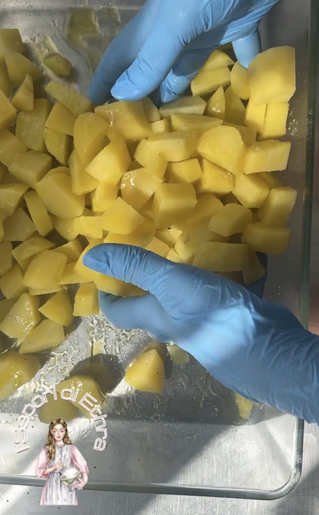 Die Kartoffeln abgießen und in eine Auflaufform geben. Mit Salz und Olivenöl extra vergine würzen.