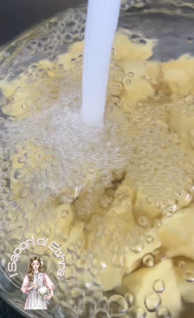 Die Kartoffeln unter fließendem Wasser abspülen, bis das Wasser klar wird und die Kartoffeln etwas Stärke verlieren.