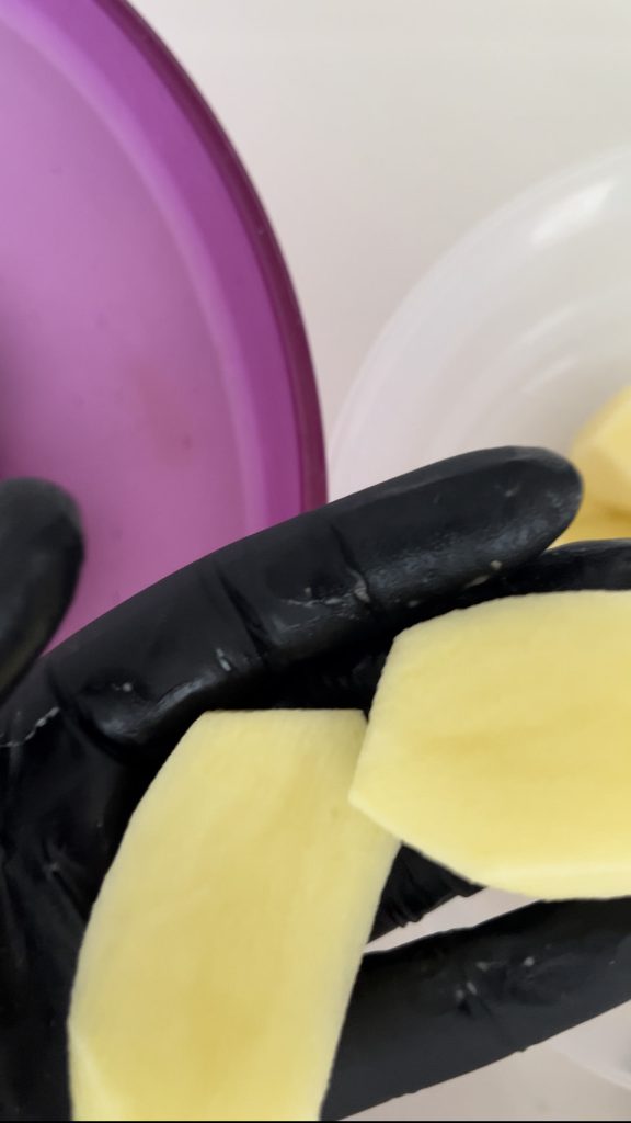 Der erste Schritt ist, die Kartoffeln gut zu waschen und zu schälen. Halbieren.