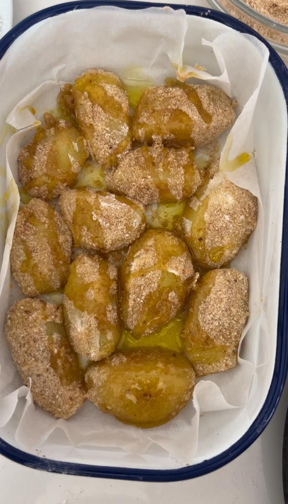 Heute ein wirklich köstliches Rezept mit einer erstklassigen Zutat, der SIEGLINDE-KARTOFFEL AUS GALATINA, Provinz Lecce, KOTELETTS VON NEUEN KARTOFFELN AUS DEM SALENTO. Ich spreche speziell über diese wirklich besondere Zutat. Der vollständige Name lautet ‚Sieglinde-Kartoffel aus Galatina‘, einem Ort in der Provinz Lecce, wo das sehr günstige Klima zwei jährliche Kartoffelanpflanzungen ermöglicht, eine Anpflanzung im Februar-März und eine sogenannte ‚Schaltjahr‘-Anpflanzung im Juli-August. Die Sieglinde wird auch in anderen Gebieten Apuliens angebaut, um all ihre Qualitäten zu erlangen, ist es wichtig, dass sie in der ‚roten Erde‘ angebaut wird, die verschiedene apulische Gebiete gemeinsam haben, dieselben, in denen der Primitivo-Weinstock angebaut wird und der kräftige gleichnamige Wein. Sehr oft sind sie zusammen auf dem Tisch, wenn sie nicht sogar in den Rezepten sind… In diesem Fall wollte ich diese Koteletts zubereiten, aber auch ein sehr guter Kartoffelsalat wäre ideal, da eine der Eigenschaften dieser Kartoffel ist, dass sie beim Kochen nicht zerfällt.