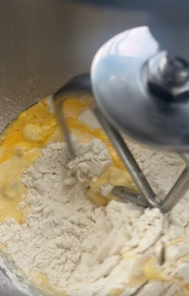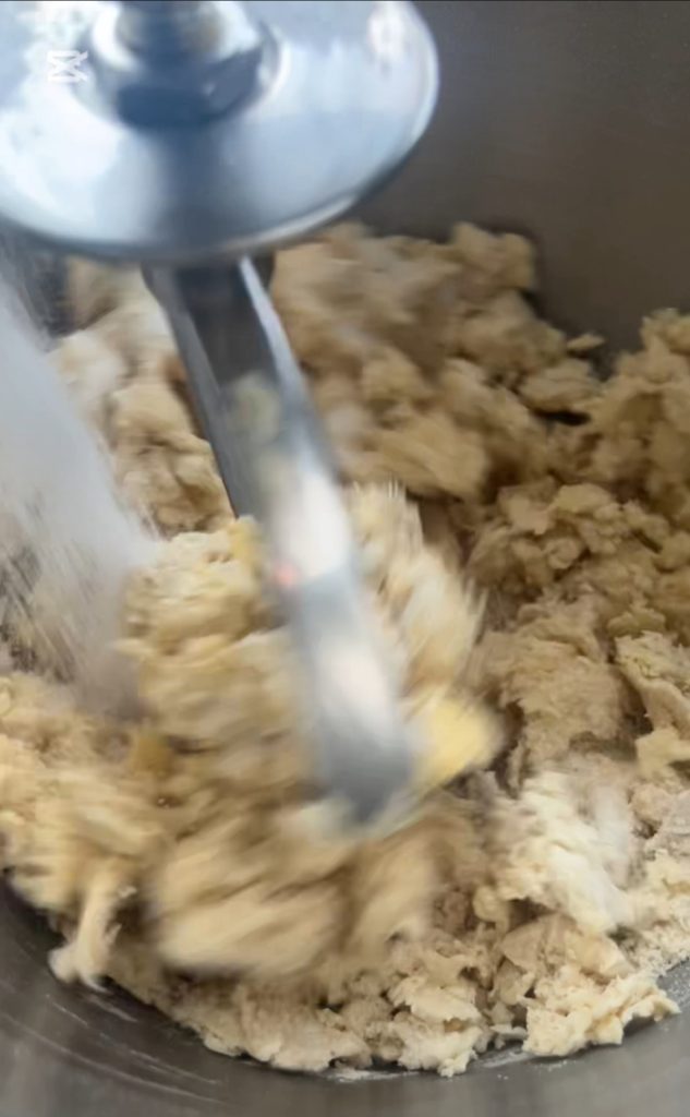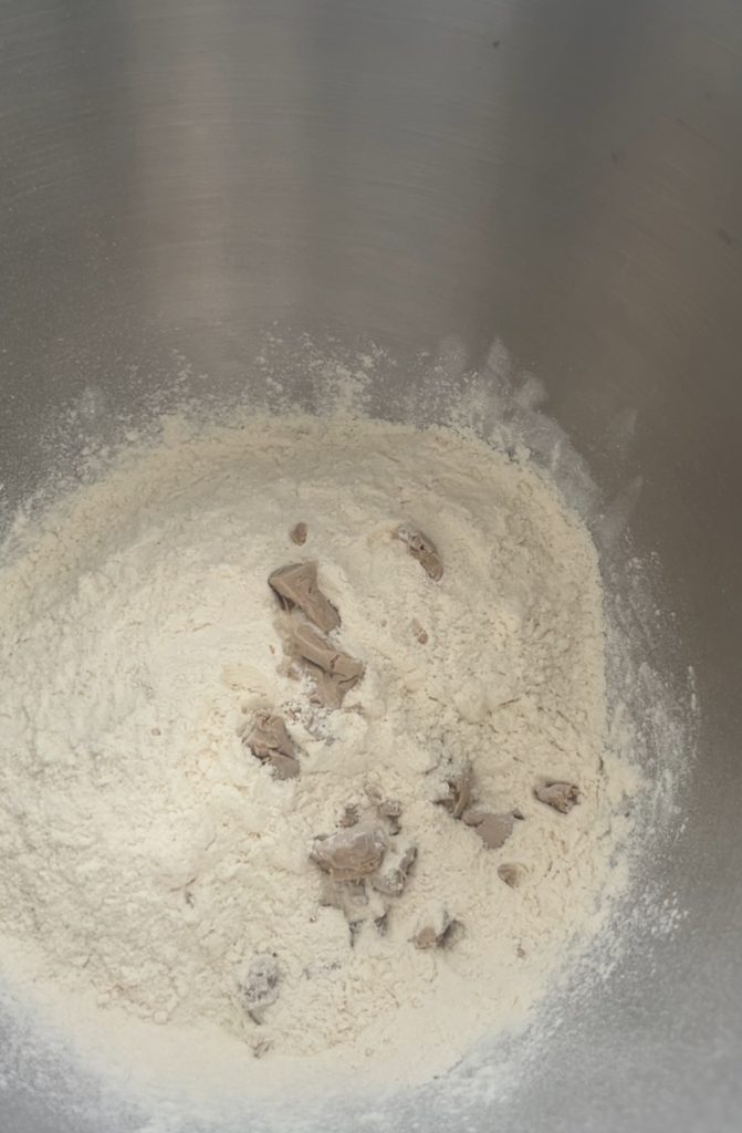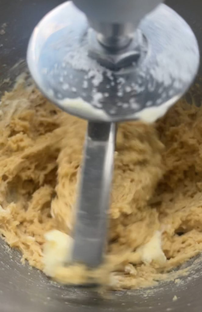 Jetzt weiche Butterstückchen nach und nach hinzufügen. Jedes Stück gut einarbeiten, bevor das nächste hinzugefügt wird.