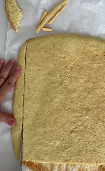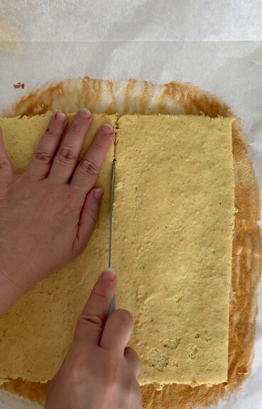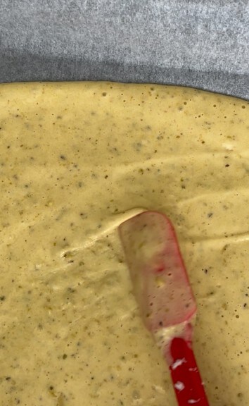 Die Masse auf ein mit Backpapier ausgelegtes Blech streichen und im vorgeheizten Ofen bei 180° 10 Minuten backen.