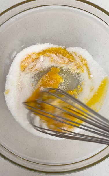 Beginnen Sie mit der Zubereitung der Vanillecreme, indem Sie in einer Schüssel Eigelb und Zucker mit einem Schneebesen vermengen.
