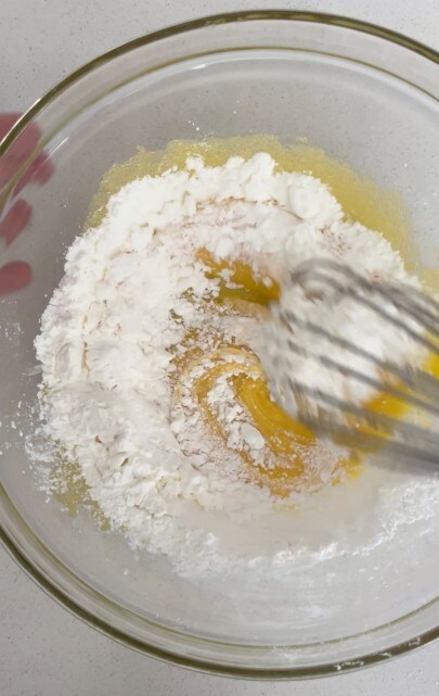 Das Mehl hinzufügen, das wir mit dem Backpulver vermischt haben.