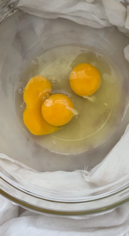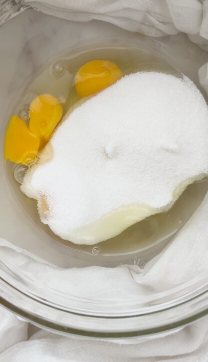Mit der Zubereitung des Kuchens fortfahren, indem Sie die Eier in eine Schüssel geben