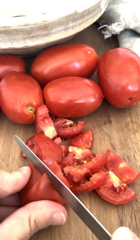 Die Pachino-Tomaten in Stücke schneiden