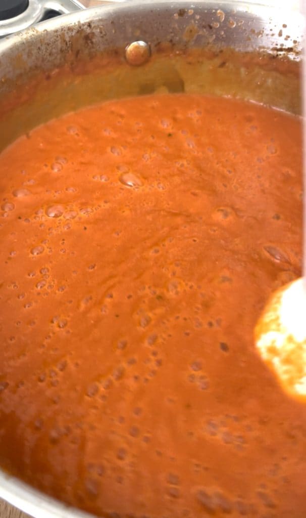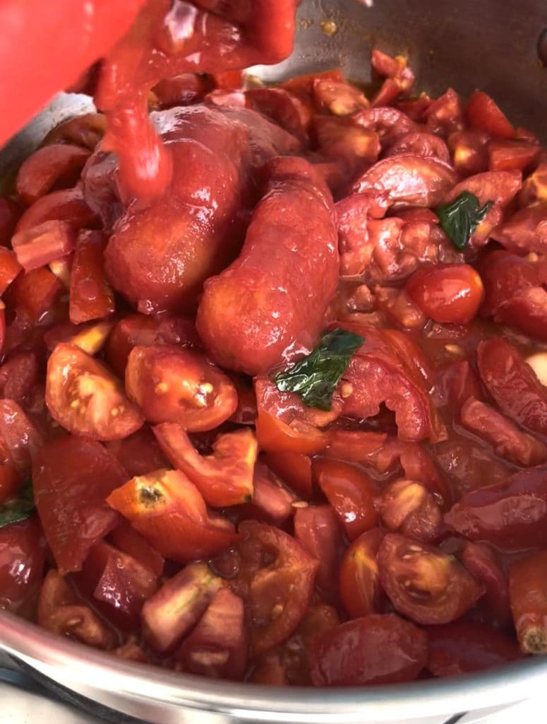 Die geschälten Tomaten hinzugeben und 20 Minuten köcheln lassen.