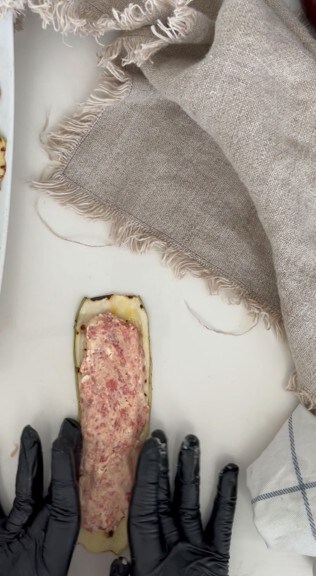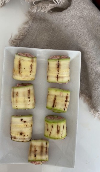 Alles gut vermengen und jede Zucchinischeibe mit der Mischung füllen
