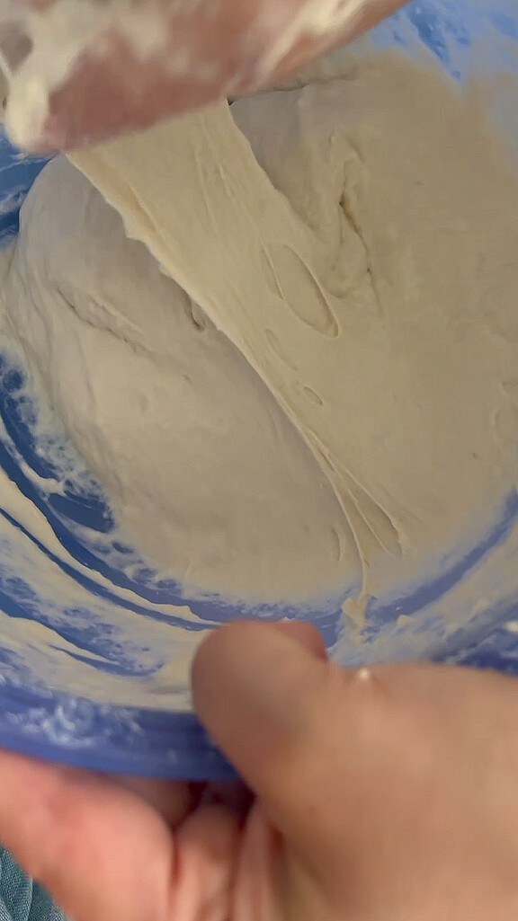Den Teig etwa 10 Minuten kräftig von unten nach oben schlagen, bis sich Blasen bilden. Das ist das Zeichen dafür, dass der Teig bereit ist, um zu ruhen