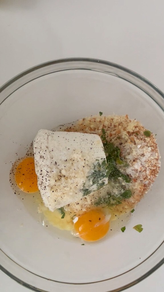 In einer Schüssel das fein zerbröselte altbackene Brot, die Eier, das Salz, den Pfeffer, den Grana, den Pecorino, den Ricotta und die gehackte Petersilie hinzufügen.