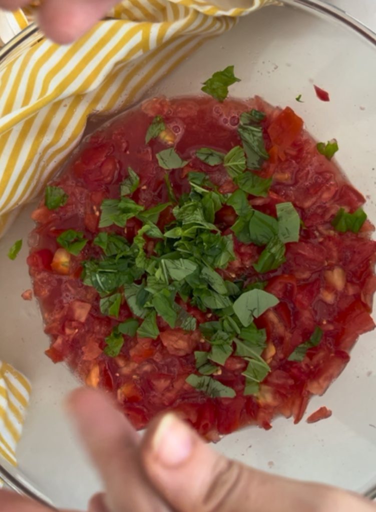 In eine Schüssel geben und das Basilikum in Stücke zupfen