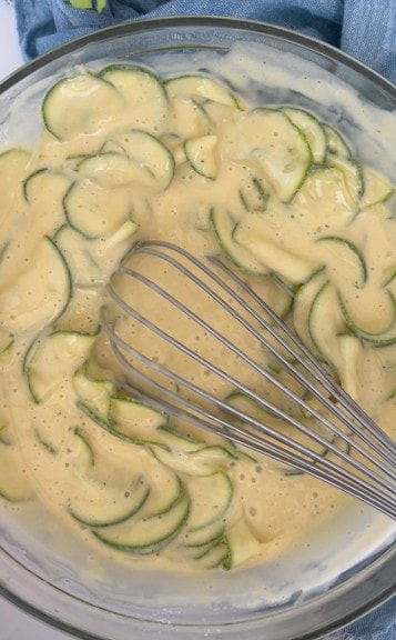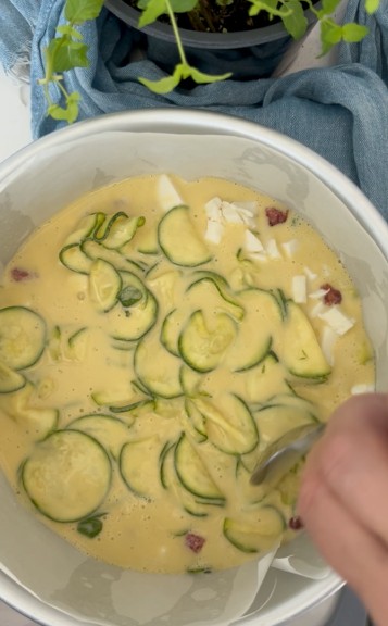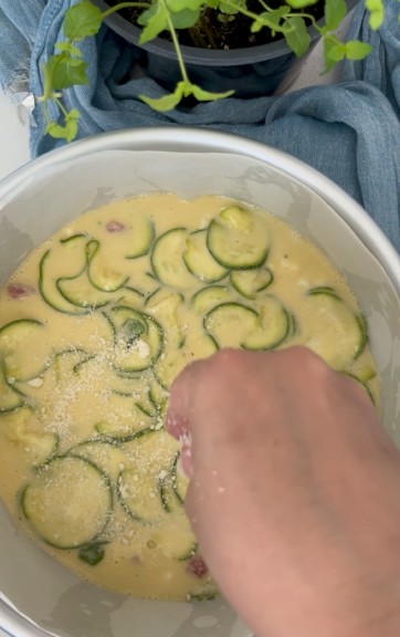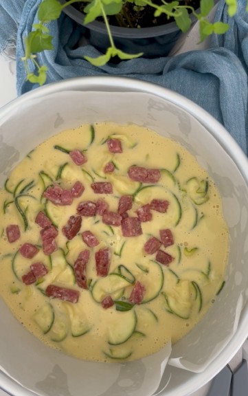 Heute, liebe Freundinnen, möchte ich mit euch ein wirklich spezielles Rezept teilen, das euch das Abendessen rettet und euch bei euren Gästen einen großen Eindruck machen wird: der SEHR WEICHE HERZHAFTE ZUCCHINIKUCHEN. Ich wollte einen herzhaften Kuchen, aber nicht den gewöhnlichen mit Blätterteig, sondern etwas Weicheres. Dieser hat sofort meinen Wunsch erfüllt und wurde von meinen Freunden, die ich zum Abendessen hatte, sehr geschätzt. Deshalb empfehle ich ihn euch. Sehr einfach mit einem einfachen Handschneebesen zuzubereiten, man braucht nur eine gute Mandoline, um die Zucchini so dünn wie möglich zu schneiden. Ich habe ihn mit Fiordilatte-Mozzarella und ungarischer Salami gefüllt, weil ich das zu Hause hatte, aber auch mit Scamorza und gekochtem Schinken oder jedem anderen Aufschnitt, den ihr verwenden möchtet, kann ich euch versichern, dass das Ergebnis ein köstlicher und weicher herzhafter Kuchen ist. Hier das Rezept.