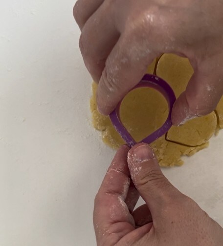 • Mit dem restlichen Mürbeteig und dem Keksstempel gestalten wir unsere Dekorationen. Ich hatte die Margeritenform