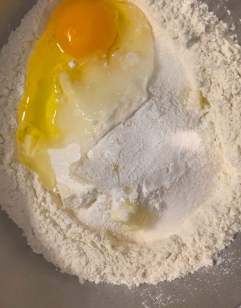 Nun in einer Schüssel den Mürbeteig vorbereiten, indem Sie das Mehl, den Zucker, das Backpulver, die kalte Butter in Stücken und das Ei hinzufügen.