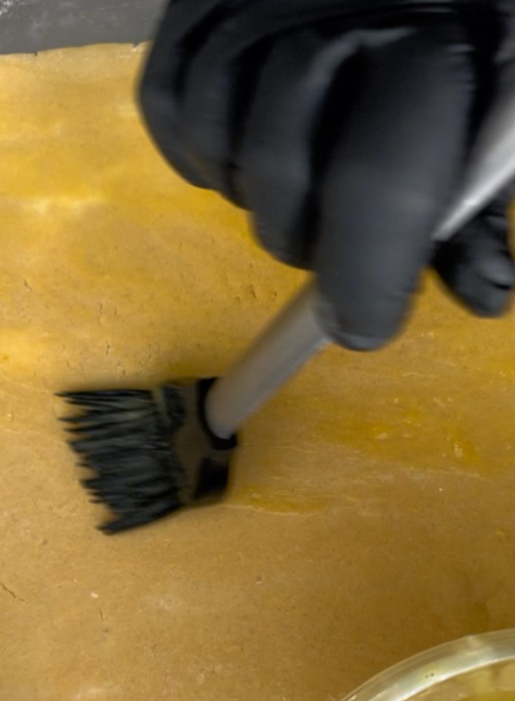 Das Mürbeteig-Rechteck mit geschlagenem Ei bestreichen